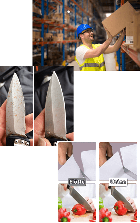 Készülj fel, hogy mostantól pofonegyszerűen vághatsz, szeletelhetsz, apríthatsz, filézhetsz megújult, borotvaéles késeiddel! Szerszámaiddal is könnyű lesz dolgozni, elfelejtheted a tompa eszközökkel való lassú és pontatlan munkát. Ez a sokoldalú találmány otthoni, konyhai, kifőzdei, üzemi és műhelyi használatra is különösen ajánlott.