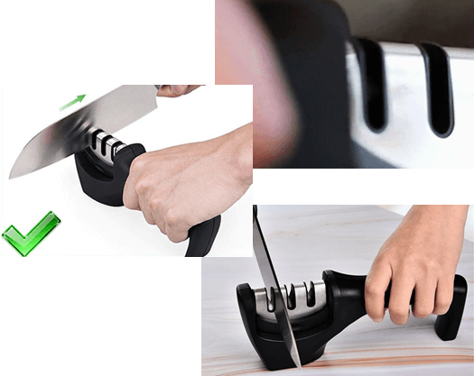 A késélező egyszerűen, szaktudás nélkül használható. Helyezd el stabilan egy asztalon, egyik kezeddel fogd meg szorosan a markolatot, másik kezeddel húzd át a késeket az egyes fázisokon magad felé, finoman nyomva, kb. 5 alkalommal, míg a kívánt élt nem éred. A nyélhez legközelebb találod a gyémántfázist, ezt követi a wolfram, majd a kerámia fázis.